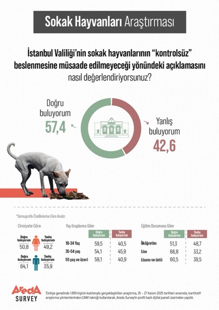 İstanbul Valiliği’nin sokak hayvanlarının kontrolsüz biçimde beslenmesine izin verilmeyeceğine yönelik açıklaması kamuoyunda geniş yankı uyandırırken, Areda Surveytarafından gerçekleştirilen araştırma toplumun konuya yaklaşımını ortaya koydu. Araştırmaya katılanların yüzde 57,4’ü uygulamayı doğru bulduğunu belirtirken, yüzde 42,6’sı ise yanlış bulduğunu ifade ediyor.